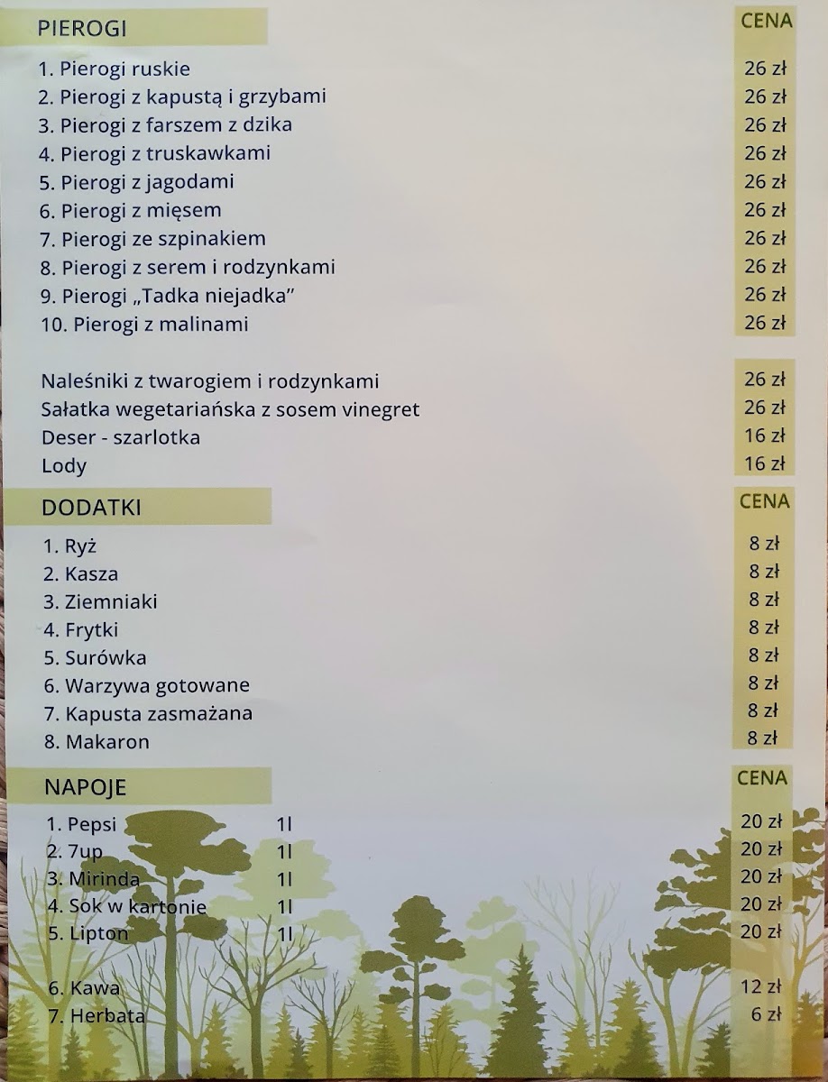 The menu continues with hearty meat options such as Bitki Z Dzika, a wild boar stew, and Zrazy Z Dzika, a succulent wild boar fillet dish, showcasing the rich game meats that are central to Polish hunting traditions. Pierogi Z Farszem Z Dziczyzny brings a twist to the traditional pierogi, filled with wild game meat, while Pierogi Z Jagodami and Pierogi Z Malinami offer sweet, berry-filled dumplings for those seeking a dessert-like experience.